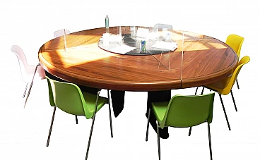 Tavolo da riunioni tondo, diam 260, in legno di noce aframosia, piedi metallo laccato nero.top con bordo spessore cm 6, parte centrale in similpelle nera. Possibilita' di passaggio cavi tra piedi e centro piano. il tavolo si smonta in vari settori, proveniente ipotizzata, ditta Unifor.