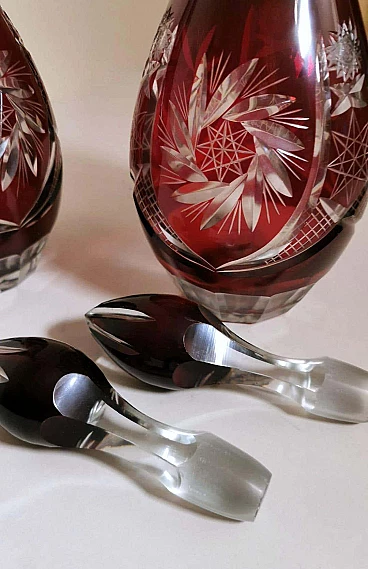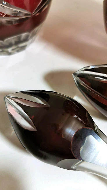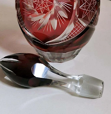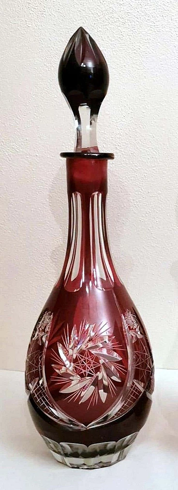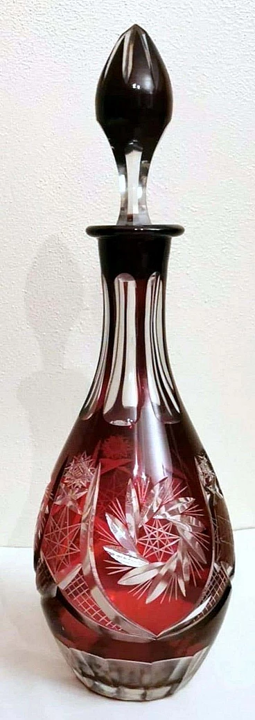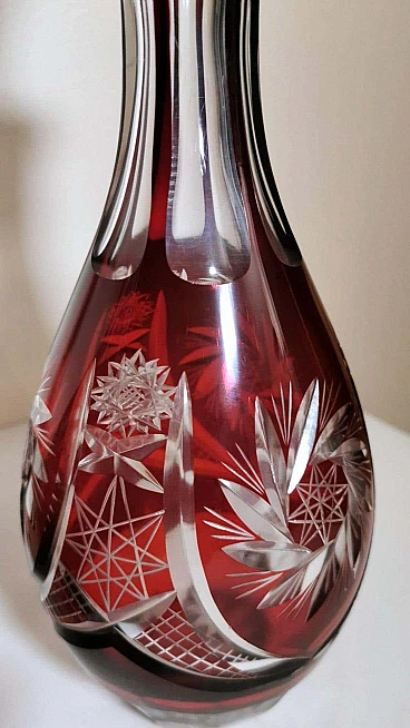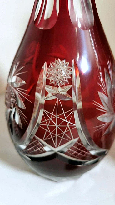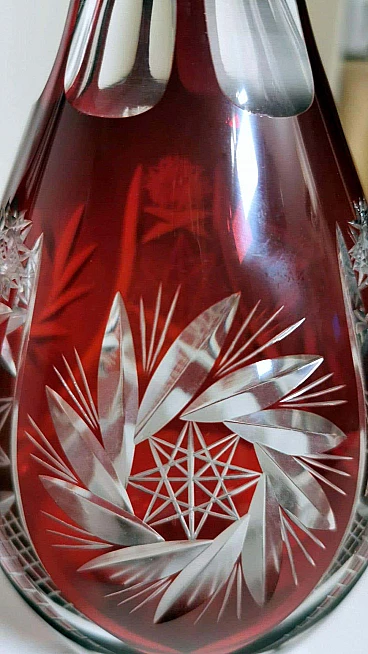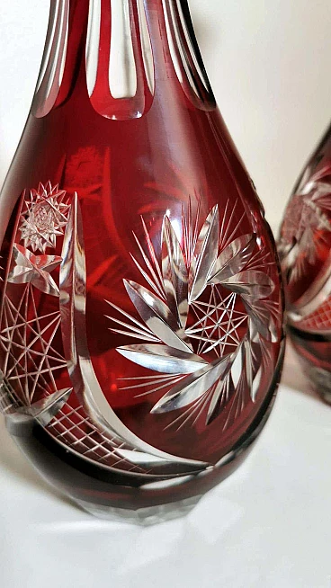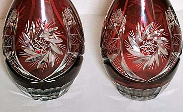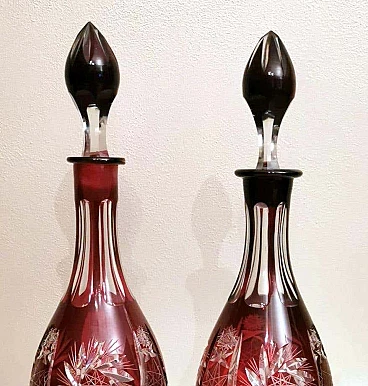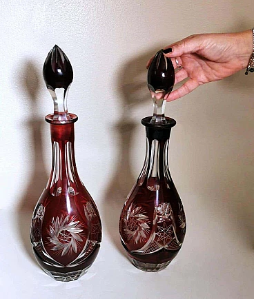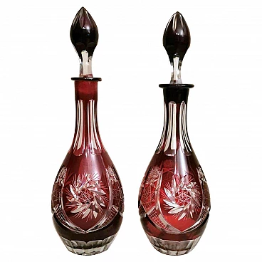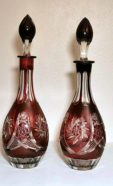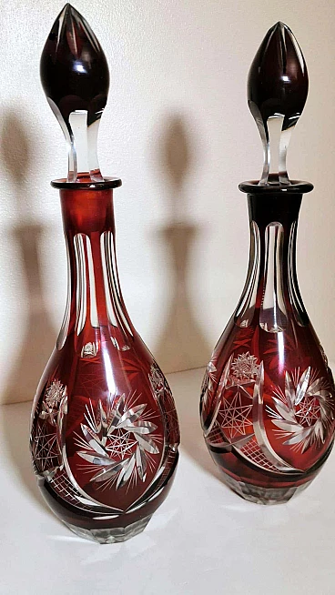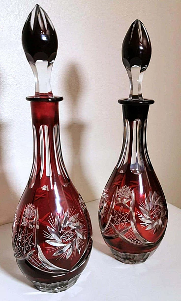 Spettacolare e suggestiva coppia di bottiglie in cristallo rosso rubino, realizzate tra il 1920 e il 1925 nella Boemia settentrionale, nella zona di Jablonec nad Nisou, in uno dei tanti laboratori artigianali del luogo dove la lavorazione, la soffiatura, la manipolazione, l'intaglio e la decorazione del vetro hanno avuto fin dall'antichità il loro massimo splendore, dove ancora oggi si concentrano numerosi negozi e botteghe di artisti e designer ai quali si deve il perpetuarsi di una delicata e antica arte. Le bottiglie hanno la classica forma a bulbo allungato e sono entrambe sormontate da un elegante tappo molato sulla punta. Gli intagli e le molature lucide sono in contrasto con le delicate incisioni geometriche. Una bottiglia è leggermente più bassa dell'altra e ha una colorazione più intensa del collo.