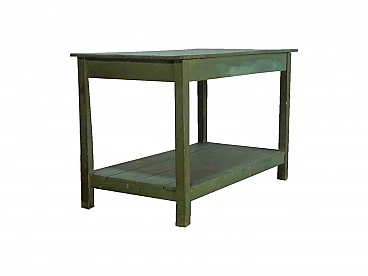Tavolo da lavoro, in abete a due piani. In patina colore verde marina. Anni 60 circa.