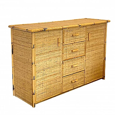 Credenza in bambù e vimini anni 70, 2 ante e 4 cassetti centrali