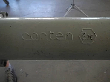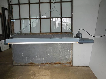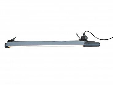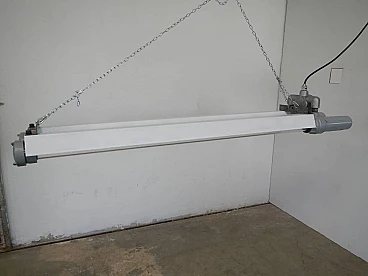 Neon industriale funzionante e restaurato a neon anni 50 ditta cartem milano da soffitto. Colore grigio e bianco.