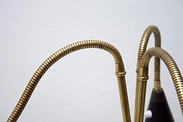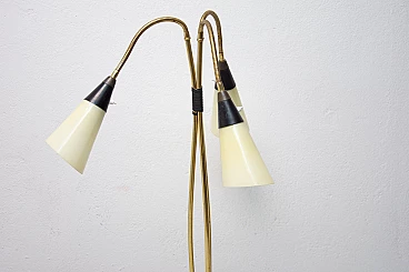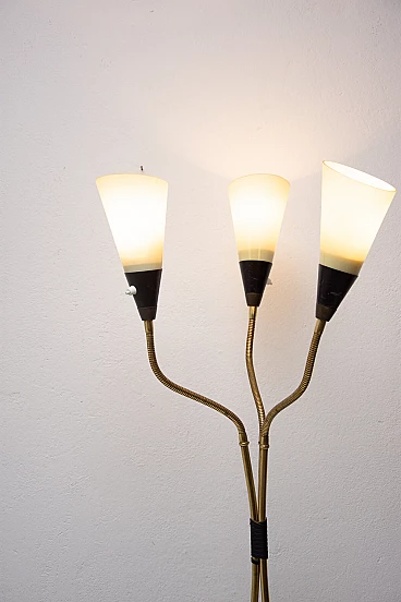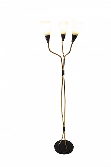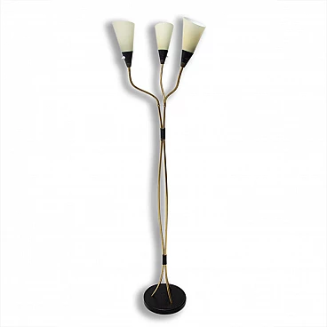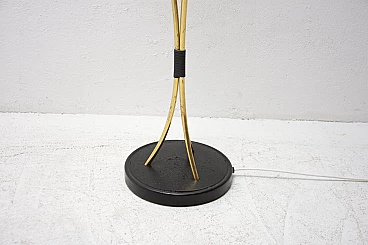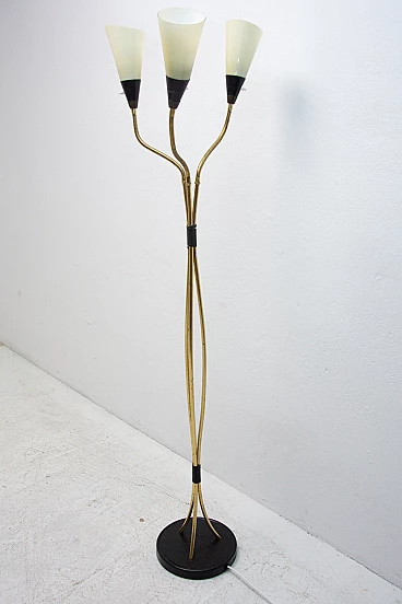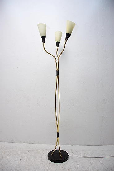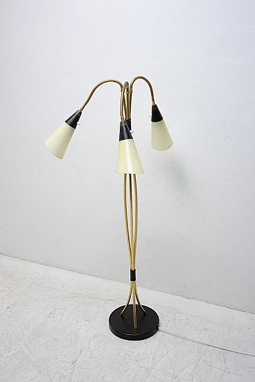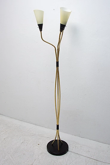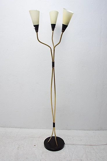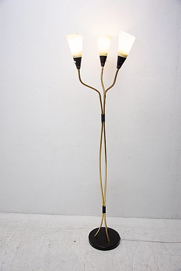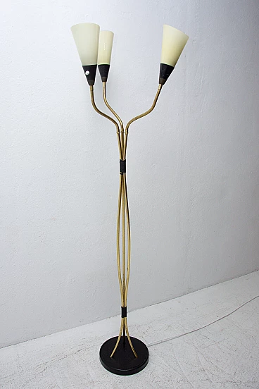 Questa lampada da terra è un tipico esempio di illuminazione cecoslovacca della metà del secolo, associata al "periodo di Bruxelles" e al famoso EXPO58. Costruzione nichelata, tre paralumi in vetro smerigliato. Nuovo cablaggio. Possibilità di regolare i paralumi in alto, in basso e lateralmente. In ottime condizioni d'epoca, mostra i segni dell'età e dell'uso. altezza del paralume: 25 cm