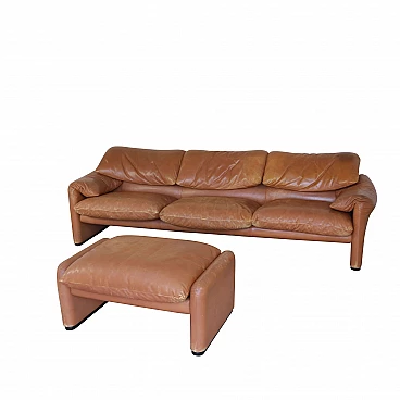 Divano 3 posti e poggiapiedi modello Maralunga disegnato da Vico Magistretti e prodotto da Cassina in pelle color cognac.