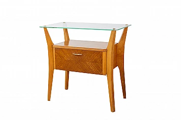 Comodino in legno di acero di Gio Ponti per la Permanente Mobili Cantù, anni ‘50. Consiste in un vano oggetti con anta a ribalta, maniglia in ottone, ripiano in cristallo con fermi in ottone. Modernariato italiano in ottime condizioni con lievissimi segni del tempo.