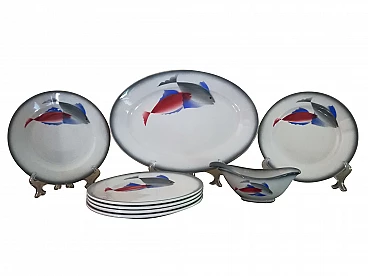 Servizio Piatti da pesce della Galvani, 6 piatti + portata e salsiera. 1934/1935 I piatti riportano disegni di pesci stilizzati con l'aerografo dal gusto fra il Decò e il Futurista del designer Angelo Simonetto. I sei piatti hanno un diametro di 23,5 cm. Il piatto da portata misura 38 x 27 cm.