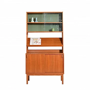 Libreria-credenza dalle linee nordiche pulite e minimali disegnata da Bertil Fridhagen per Bodafors nei primi anni '60. La parte alta del mobile in legno teak presenta due mensole con ante scorrevoli in vetro e un portariviste il legno teak. La parte bassa del mobile vintage è un piccolo sideboard con ante scorrevoli e impugnatura in legno curvato. La particolarità di questo mobile è data dalla sua versalità; può infatti essere utilizzato con o senza la parte superiore, come libreria o sideboard, ma anche essere accostato a uno o più mobili della stessa altezza per formare una parete attrezzata in stile vintage.