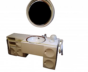 Mobile per il bagno di design degli anni '70. Il mobile è in legno laccato e si presenta in ottimo stato nonostante qualche piccolo segno del tempo. Il lavello in metallo smaltato è pari al nuovo. E' completo di grande specchio sempre in legno retroilluminato da un neon circolare. Completa il set un portasapone da muro e il portasciugamani da parete per il bidè. Il mobile misera 150 cm. x 59 cm. ed è smontato pronto da portare via.