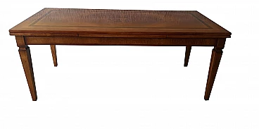 Grande tavolo in noce e piuma di noce con filetti di Bosso, rosone al centro del piano, gamba piramide rovesciata, misura 200 X 95 aperto 3 m x 95.