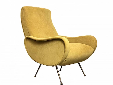 Poltrona Lady anni '50. Design attribuito a Marco Zanuso. Capolavoro del made in Italy, Lady è stata premiata con la Medaglia d’Oro alla IX Triennale di Milano del 1951. La poltrona è di manifattura Italiana, completamente restaurata con rivestimento e interni nuovi, tessuto di micro velluto di colore Light yellow, inconfondibile stile della scocca del designer Marco Zanuso, piedi in metallo e ottone con il tipico design degli anni 50. Condizioni perfette. Misure: altezza seduta cm 40 / Seduta cm 50 X cm 50