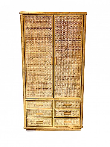 Armadio anni 70 in vimini e bambù, due ante e 6 cassetti.
