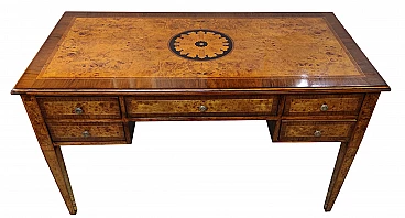Scrivania Lombardo in radica di betulla, noce con rosone centrale in acero piede a piramide rovesciata. Epoca anni '30, lucidatura a gommalacca.
