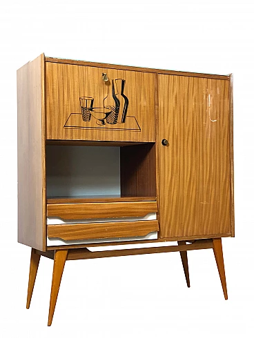 Mobile bar anni '60 di manifattura italiana, completamente in legno, anta apribile con 2 ripiani interni, anta a ribalta con piano e mensola sagomata in vetro molato, 2 cassetti, piano superiore in vetro di colore azzurro, piedi in legno di faggio a forma conica con il tipico design degli anni '60. Effettuato restauro conservativo. Condizioni perfette