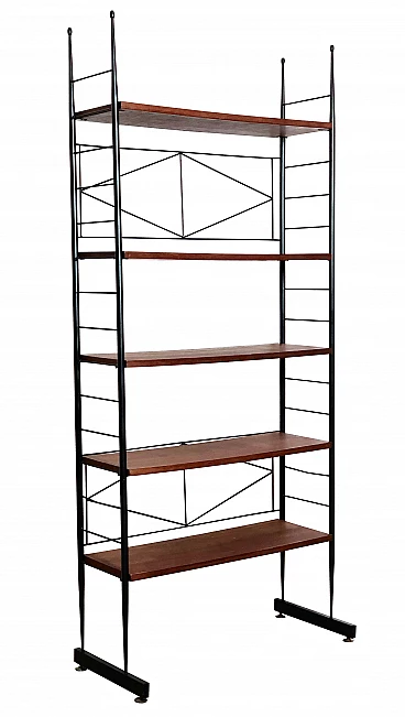 Libreria modulare anni '60 - Made in italy -. La libreria è di manifattura italiana, completamente restaurata, struttura in metallo con serramenti in ottone, ripiani tutti regolabili realizzati in legno impiallacciato teak. La libreria è composta da 5 mensole, puntali in ottone regolabili. Condizioni perfette