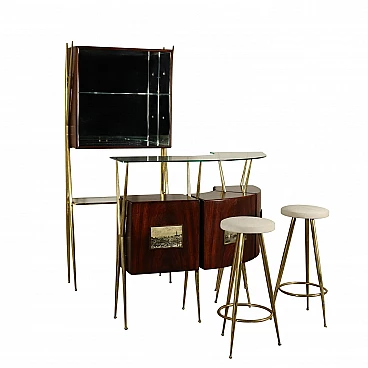 Elegante mobile bar di manifattura italiana anni '50 in legno impiallacciato in mogano, ottone e vetro. Il set è composto da uno scomparto a muro con vari scaffali e porte in vetro, sorretto da struttura in ottone. Un banco semicircolare con piano in vetro, scomparti e cassetti e tre stampe decorative sul fronte, completo di gambe diagonali in ottone. E coppia di sgabelli rotondi con seduta in similpelle e gambe diagonali in ottone. Qualche difetto.