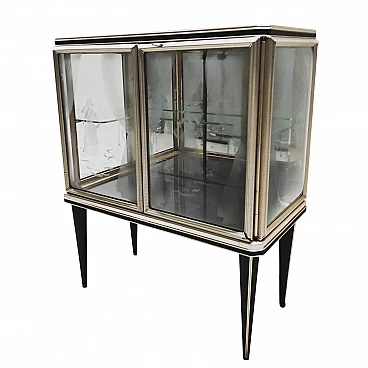 Vetrinetta Bar anni 50 Umberto Mascagni. Elegantissimo mobile bar in vetro degli anni 50 design Umberto Mascagni . In perfetto stato di conservazione , struttura con elegante e lavorata finitura argentata , vetri bombati e finemente lavorati e decorati, ante a battente , ripiano interno in vetro per contenere bottiglie, bicchieri e cristalleria , piedini rivestiti in pelle nera , dettagli in pelle , luce interna con porta lampadina alimentata con spina di corrente . Misure Altezza 92 cm, Larghezza 77 cm , Profondità 42 cm .