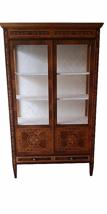 Bella vetrina Lombarda in noce canaletto con intarsi a motivo neoclassico in acero, piede a piramide rovesciata, un cassetto nella parte bassa, parte alta con vetri sulle ante frontali e laterali, ripiani interni rivestiti in tessuto damascato, epoca anni '30