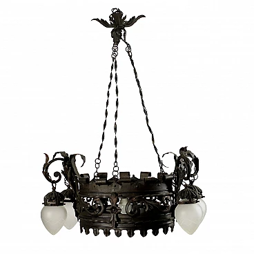 Lampadario in ferro battuto e lamierino a cinque luci, di cui una centrale, decorato a motivi vegetali.