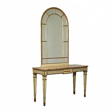 Consolle in stile sorretta da gambe tronco-piramidali, interamente laccata e dorata; piano in marmo (presenta una rottura), sul quale poggia una grande specchiera.