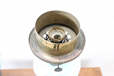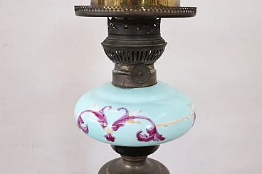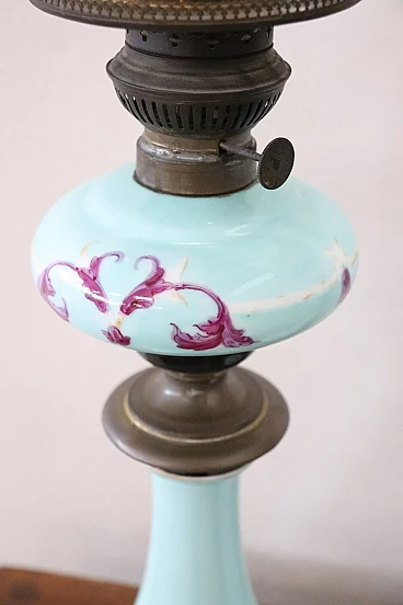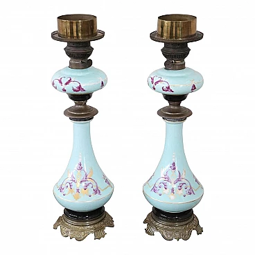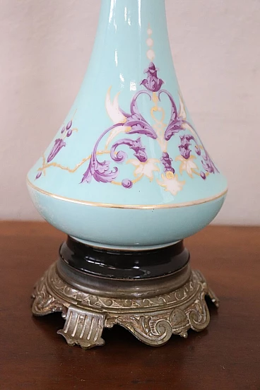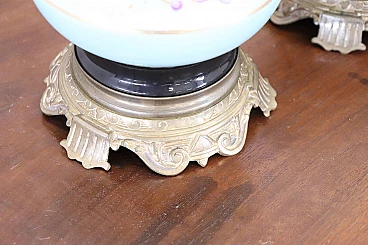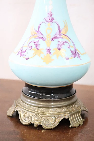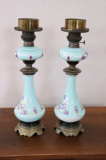 Bellissima coppia di lampade da tavolo antiche ad olio realizzate in ceramica dipinte a mano ed elegante base in bronzo cesellato. Le lampade hanno subito modifica per poter essere elettrificate, l'impianto elettrico non è presente. In origine probabilmente era presente anche una boccia in vetro. Alcuni segni di usura nella decorazione. Vi consigliamo comunque di guardare bene in dettaglio tutte le foto allegate. Proposto ad un'ottimo prezzo trattabile vi invitiamo ad inviarci le vostre proposte di acquisto le valuteremo con piacere.