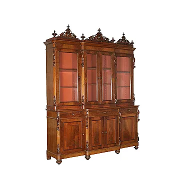 Credenza umbertina sorretta da piedini torniti, sul fronte spezzato presenta nella parte inferiore quattro ante sormontate da tre cassetti e alternate da montanti intagliati con mensole a ricciolo e festoni di frutta; movimento simile ripreso anche nella parte superiore con ante dotate di vetri. Cimasa intagliata e traforata con elementi fitomorfi e torniti. In mogano e piuma di mogano.