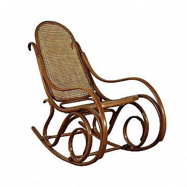 Sedia a dondolo tipo Thonet, in faggio ricurvo, la seduta e lo schienale sono incannucciati.
