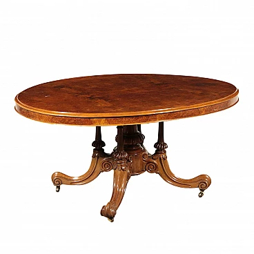 Sorretto da un balaustro centrale tornito affiancato da quattro montanti, poggianti su quattro gambe mosse e intagliate a ricciolo, dotate di rotelle. Il piano e la fascia sottostante sono impiallacciate in radica di noce.