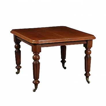 Tavolo allungabile a manovella, sorretto da gambe tornite, è dotato di rotelle. In mogano.
