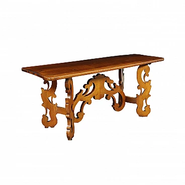 Tavolino fratino in stile, sorretto da gambe mosse e intagliate a volute, così come la traversa centrale, in faggio. Il piano in noce ad asse unica è antica.