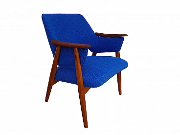 Design scandinavo, poltrona. Prodotto nel 1960 circa. Braccioli in teak e gambe in faggio tinto. Completamente rinnovata da un artigiano, tappezziere di mobili. Imbottitura nuova di zecca. Nuovo rivestimento in pregiato tessuto di lana KADADRAT blu di qualità disegnata da Nana Ditzel - Hallingdal 733. I componenti in legno non hanno difetti, ma possono mostrare lievi tracce d'uso. Questo oggetto d'epoca è in ottime condizioni perché è stato ristrutturato con nuove tappezzerie e/o rifiniture.