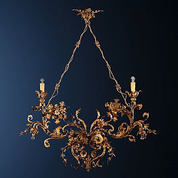 Il lampadario è stato creato nel XIX secolo unendo due grandi applique da muro d'epoca barocca; sono realizzate in ferro battuto, lamierino di ferro lavorato e parti in legno, ad imitare rami floreali, il tutto dorato. Da due grandi volute in ferro battuto, dipartono vari rami a cui si innestano, grazie a dei ribattini, le larghe foglie d'acanto in lamierino. Dei fiori sono composti con dei petali in lamierino di ferro i cui cuori sono realizzati in legno ed inseriti in quello che rappresenta il pistillo; due fiori rivolti verso l'altro fungono da porta-cero, oggi elettrificato. Uniti nell'800 a formare un unico lampadario, sono stati aggiunti dei ferri concatenati terminanti in un cespo in foglie dorate dove il lampadario si aggancia al soffitto.