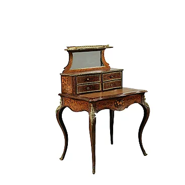 Elegante scrittoio Napoleone III da centro, retto da gambe mosse. Nella fascia sagomata un cassetto con vani e coperchi intarsiati scorrevoli. Piano scorrevole con inserto in pelle. L'alzata mossa sul fronte e nei fianchi presenta quattro cassetti e alzatina con specchiera e ripiano. Finemente intarsiata giocando con il contrasto tra bois de rose e palissandro. Arricchita da fregi e cornici in bronzo. Fabbricato in Francia, seconda metà del XIX secolo.