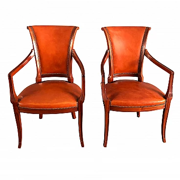 Coppia di poltroncine neoclassiche stile impero in noce e cuoio