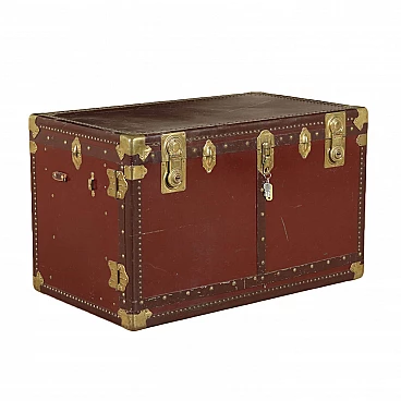 Baule con scomparti e cassetti, in legno compensato con profilature in alluminio e chiusure in ottone.