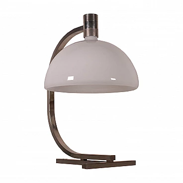 Lampada da tavolo; metallo cromato, vetro bianco.