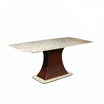 Tavolo da pranzo anni 50 con piano in marmo bianco con venature sui toni del rosa, base trapezoidale in legno, marmo e profilo in ottone.