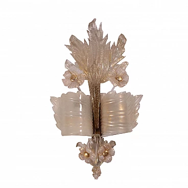 Applique in vetro Murano lavorato a fiori e volute fogliacee, con sfumature dorate; a due luci.