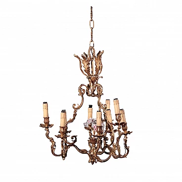 lampadario in stile a nove luci, in bronzo dorato e lavorato a motivi fitomorfi, nella parte centrale ornato da fiori in ceramica smaltata.