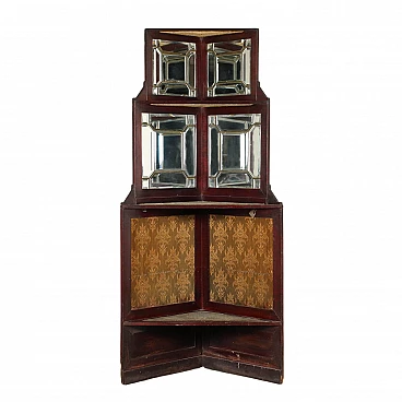 Angoliera Liberty, nella parte inferiore presenta un vano a giorno con mensola, foderato con stoffe coeve, mentre nella parte superiore presenta vetri bisellati. In mogano.