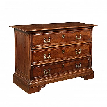 Canterano Barocco lombardo-veneto, sorretto da piedini intagliati a mensola, sul fronte presenta tre cassetti impiallacciati in noce quadripartito con filettature in acero e maniglieria in bronzo. Il piano è in noce massello, gli interni sono in pino.