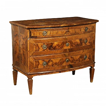 Cassettone piacentino neoclassico, sorretto da gambe tronco-coniche strette da un collare nella parte superiore, sul fronte curvo presenta due cassetti più uno posto nella fascia sottopiano. In noce, con riserve impiallacciate in radica di noce e filettature in acero, gli interni sono in pioppo.