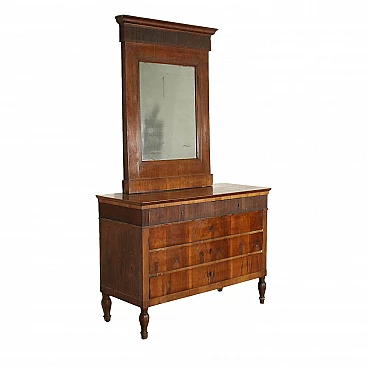 Comò Carlo X sorretto da piedini torniti, sul fronte presenta tre cassetti più uno posto nella fascia sottopiano grissinata; sul piano poggia la specchiera con cornice terminante con trabeazione grissinata. In noce.