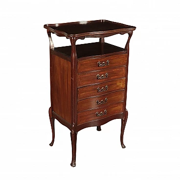 Comodino Liberty sorretto da quattro gambe mosse, sul fronte presenta cinque cassettini. Dal pianetto superiore si prolungano i montanti a sorreggere un vassoio dal grembiale sagomato e a formare un vano a giorno.