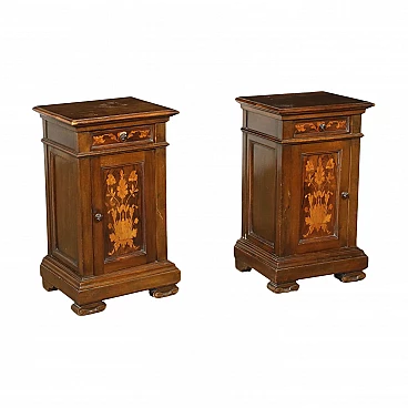 Coppia si comodini liberty, sorretti da piedini dei quali quelli anteriori a mensola e intagliati a ricciolo. Sul fronte presenta un'anta sormontata da un cassetto posto nella fascia sottopiano. In noce, presentano intarsi vegetali in acero.