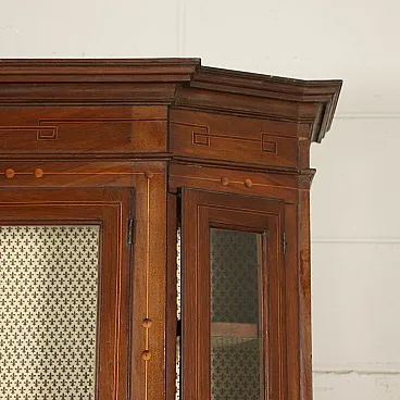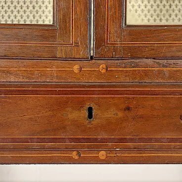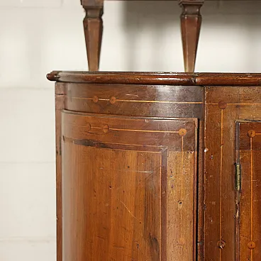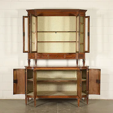 Credenza a due corpi friulana neoclassica, sorretta da piedini tronco-piramidali stretti nella parte superiore da un collare, sul fronte presenta due ante, due antine anche sui fianchi a mezza luna. L'alzata poggia sul piano ad asse unica in noce, anch'essa sorretta da pedini tronco-piramidali con dadi di raccordo intagliati con rosoni; nella fascia inferiore presenta una fila di cassettini, sormontati da due ante con vetri centrali e altrettante ante poste nei fianchi a 45°. In noce e amaranto con filettature in acero, gli interni sono in abete.