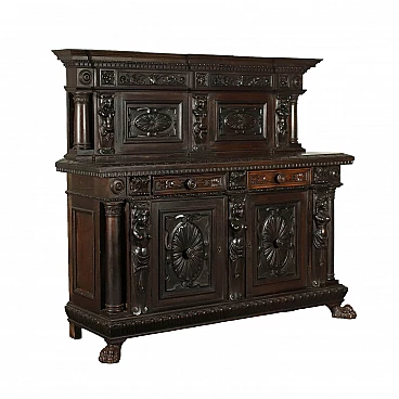 Credenza in stile neorinascimento, sorretta da piedini dei quali quelli anteriori leonini, sul fronte presenta due ante alternate a cariatidi e inquadrate tra coppia di colonne a sostenere la fascia sottopiano, nella quale si trovano due cassetti. Sul piano poggia un'alzata che ripropone la modularità e gli intagli della parte inferiore.