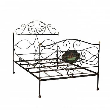 Letto in ferro battuto con rotelle, nella pediera è presente un medaglione nel quale è dipinto un paesaggio.