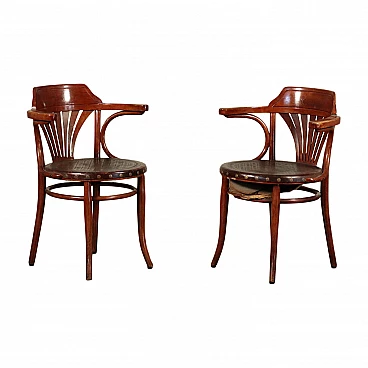 Coppia di sedie Thonet, rara versione del modello n. 233. Sorrette da quattro gambe mosse nel piede, stabilizzate da un elemento circolare che funge da traversa e che riprende la forma della seduta, anch'essa circolare e rivestita da papier pressé a finto cuoio, lavorata con motivo a losanghe e roselline, fissata con borchie. Lo schienale a giorno è traforato e integra i braccioli, che si collegano alla seduta con due elementi a forma di “C”. Presente stampiglia “THONET”. Necessita di consolidamento nella parte sottostante della seduta.