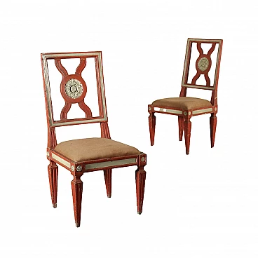 Coppia di sedie neoclassiche laccate, seduta imbottita e schienale a giorno con rosone intagliato.