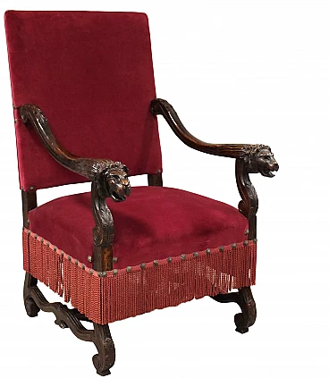 Poltrona trono Rinascimentale in noce massello, '800. In buone condizioni di conservazione (vedere foto). Rilasciamo certificato di autenticità.