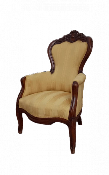 Elegante poltrona Luigi Filippo realizzata in noce massello. Presenta gambe anteriori mosse, schienale con cimasa intagliata , braccioli imbottiti. Rivestita in tessuto rigato giallo. Si presenta in buonissime condizioni, restaurata pochi anni fa (struttura e imbottitura in ottimo stato, il tessuto presenta piccoli segni di normale utilizzo - vedi foto). Epoca seconda metà '800. Altezza seduta 40 cm.